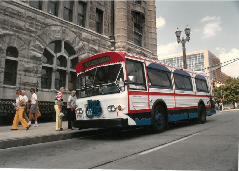 This is a photo of the Levee Line, outside of Union Station on Market Street, in 1986. The Levee Line operated in the mid to late 1980s as a downtown circulator that traveled along the riverfront, through Laclede’s Landing, and on Washington, Broadway and Market.