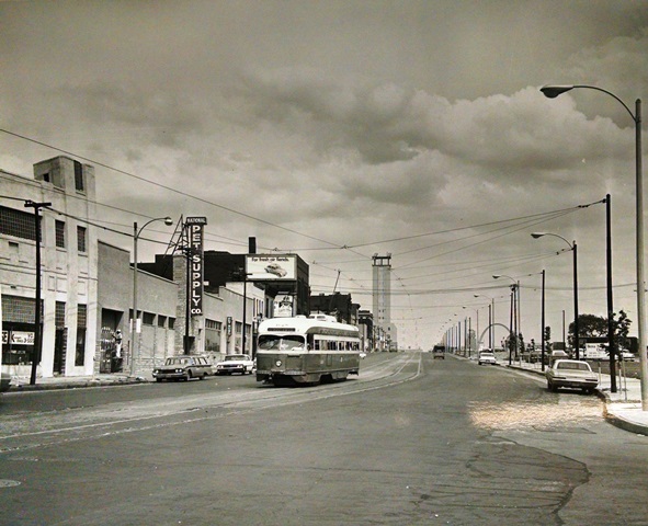 This is a Hodiamont streetcar going westbound on Olive at Compton. The top of the Gateway Arch in the background is a clue that the photo was taken in the mid-1960s after the Arch was topped out in 1965, but before the Hodiamont line’s final run in 1966.