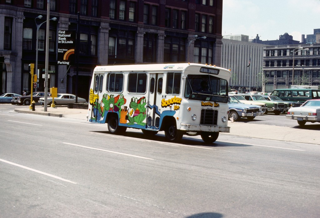 Today’s photo hearkens from the disco era of big sedans and colorful graphic designs. Both are evident here as a downtown “Scooter” bus scoots along Olive Street near 4th Street in May of 1978. Speaking of disco, the number one hit song during the month this photo was taken was “Night Fever” by the Bee Gees.