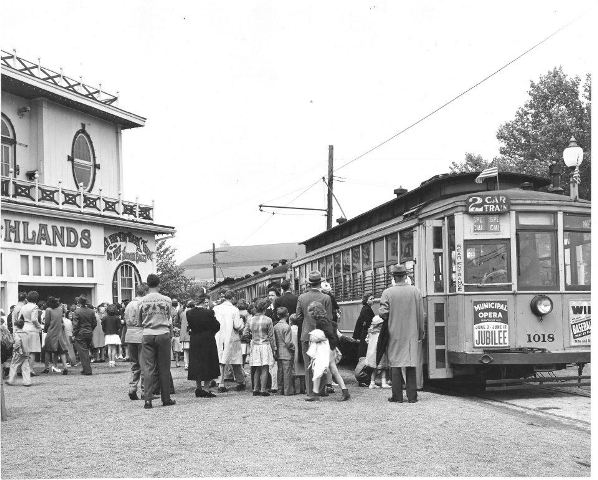 Tremendous picture of a totally different time. This is probably a school group arriving at the Highlands for the annual school picnic. Each grade school had a picnic day in the spring of the year, and went to the Highlands on chartered streetcars (notice “SPECIAL” under the 2car train sign). Attendees were on their own for the return trip, providing fares for the Public Service Co